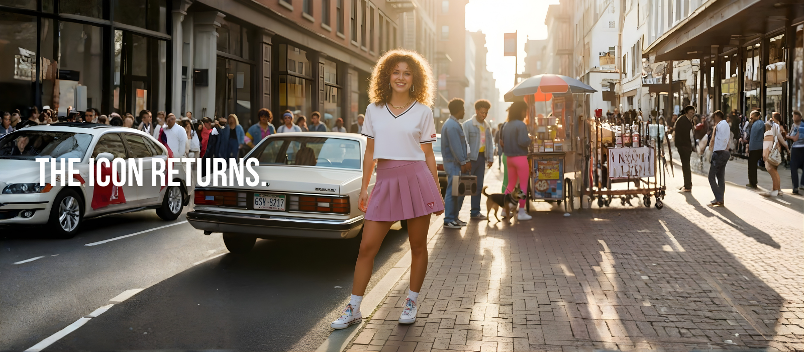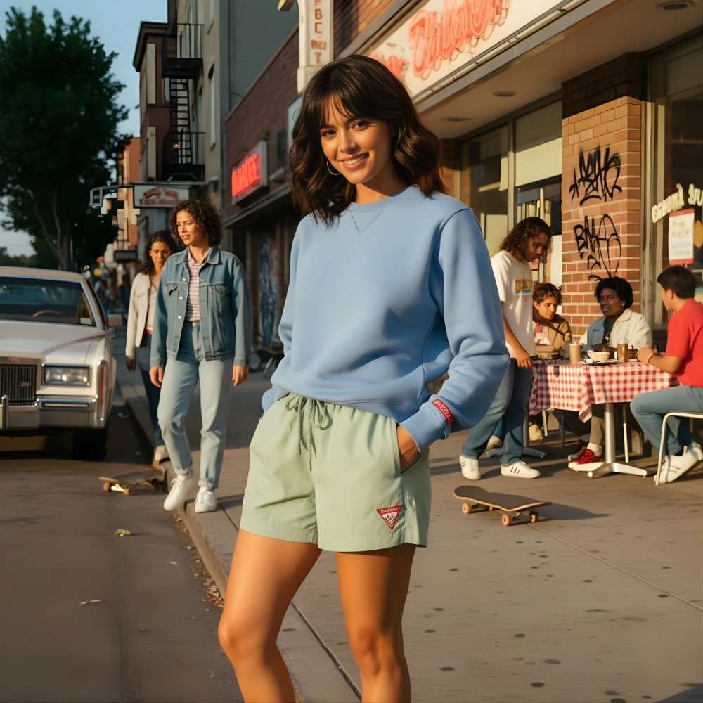 Own the street with confidence and comfort. This sporty-chic look pairs retro-inspired shorts with a sleek black top, perfect for sunny days and spontaneous city adventures. A vibe that’s equal parts vintage and fresh, made for those who move with style.